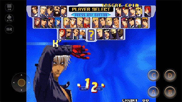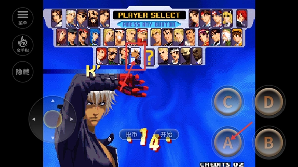 进入【PLAYER-SELECT】界面后,先挑选核心角色(例如【K'】),接着搭配援护角色,最后按下【开始】键确认所选阵容。